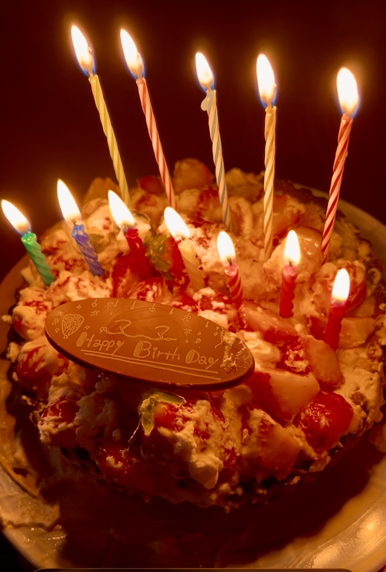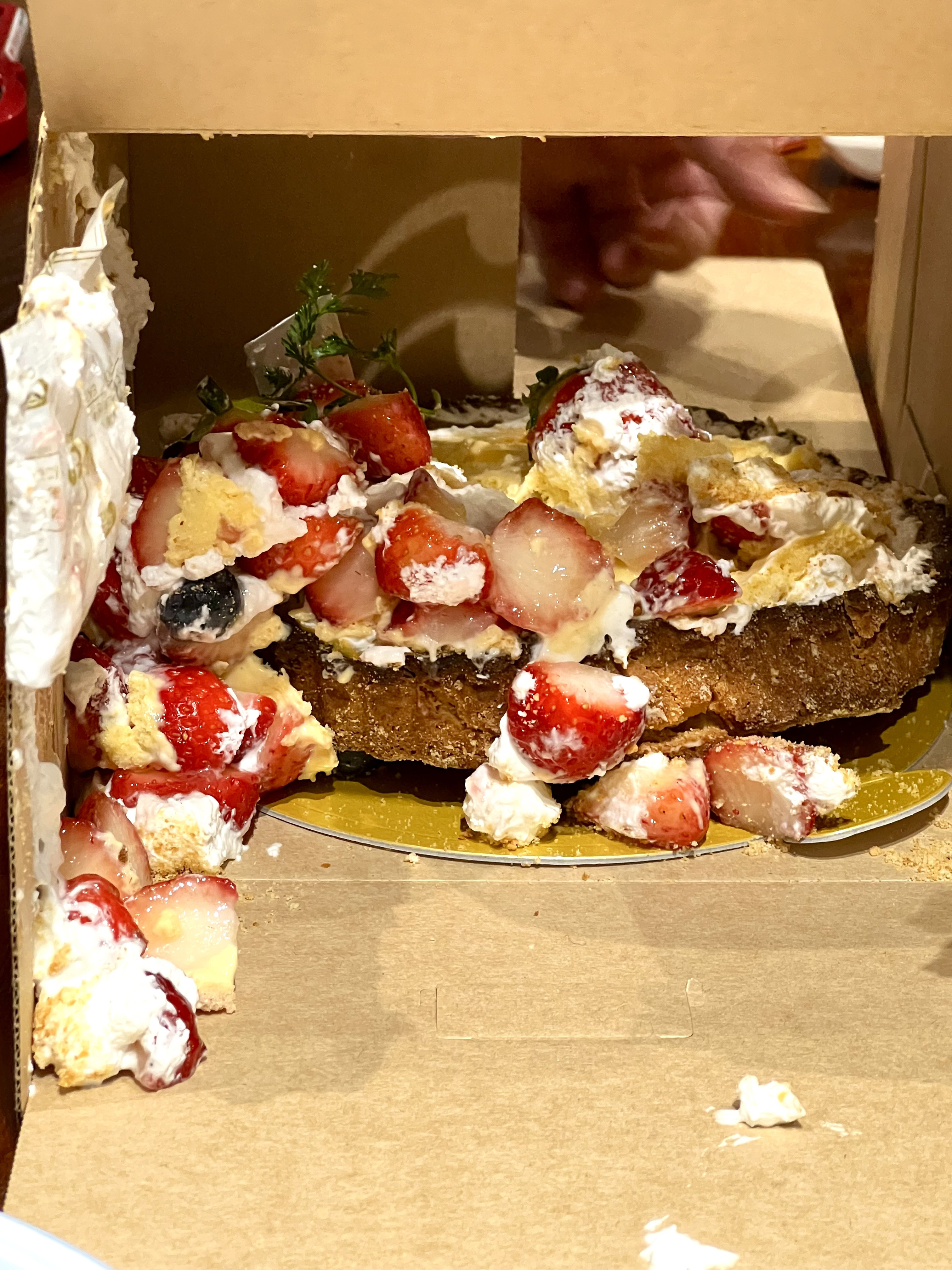 って娘がケーキを取りに行ったところ、腕が扉に当たったとかで、箱ごと落っことしたみたい💦。