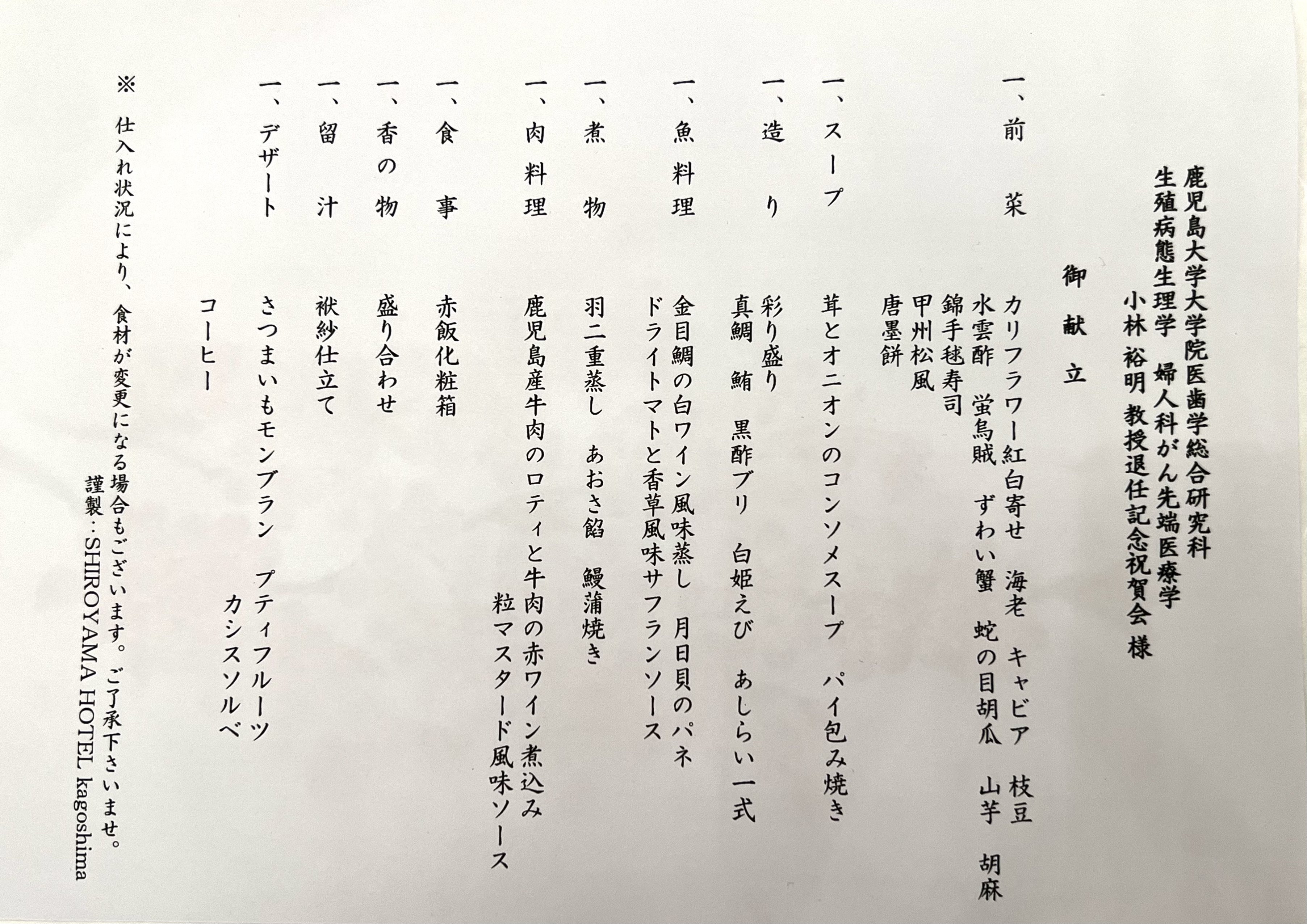 昨日は、城山ホテルKAGOSHIMAにおいて鹿児島市立病院産婦人科部長である、上塘正人先生の退官記念祝賀会が行われました。上塘先生は、私が鹿児島市立病院で研修していた時の先輩になります。城山ホテルなので美味しい料理とお酒を堪能できるぞ!と楽しみにしておりました。